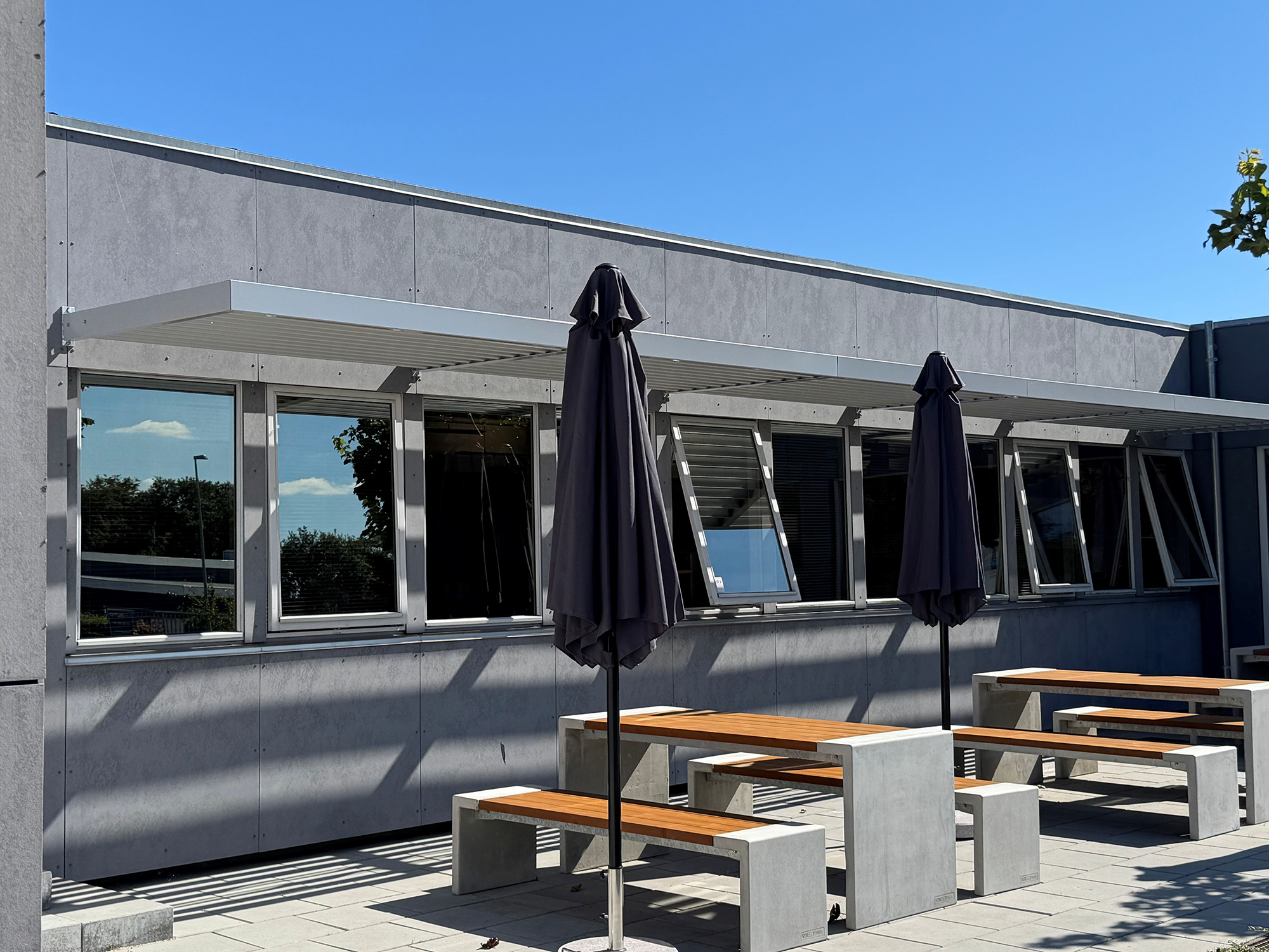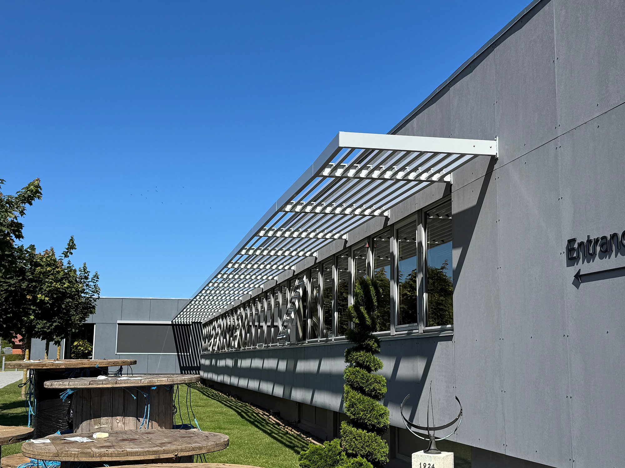 Produkt: Fast solafskærmning, type TC 110 samt indvendige motoriserede rullegardiner af typen Luxaflex XL med dugtype Verosol Silverscreen.